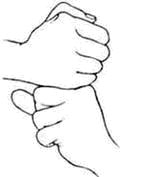 • Правой рукой обхватите этот поднятый указательный палец снизу, охватывая его всеми пальцами. Ваша правая рука как бы «захватывает» палец левой.